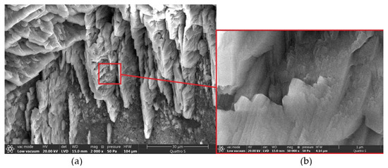 Microstructure of calcium hydroxide on the pore surface in the modified cement matrix of optimal composition at different magnifications: (a) 2000, (b) 50,000.