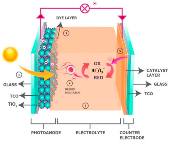 Electrical energy conversion from renewable sources—such as wind, sun, and tide—is one of the considerable concerns in the 21st century world. Converting sunlight directly into electrical energy using photovoltaic technology have been considered as one of the low-cost and high efficiency methods. For the first time, B. O’Regan and M. Grätzel reported dye-sensitized solar cells (DSSCs) in 1991 for obtaining electricity [22]. During the last few decades, DSSC technology has been developed and power conversion efficiency of this technology has been reported as greater than 14% [23]. Typical DSSC is comprised of a photoanode, a counter electrode (CE), and an electrolyte as a separator as shown in Figure 1 [24].