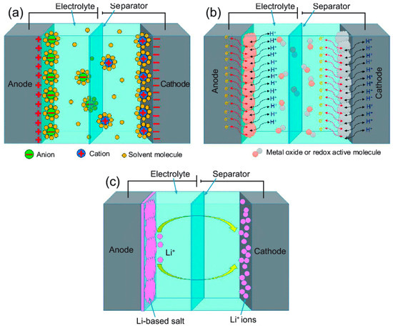 Schematic illustration of comparison between (a) an electrical double-layer capacitor, (b) pseudo-capacitor, and (c) hybrid supercapacitor. Reprinted from [116], under open access license from Oxford University Press.