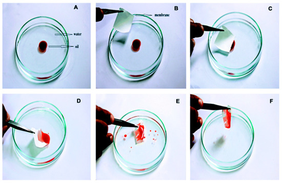 (A–F) Selective sorption of oil from contaminated water surface using hybrid membrane of bee’s wax and polycaprolactone [132] published by The Royal Society of Chemistry.