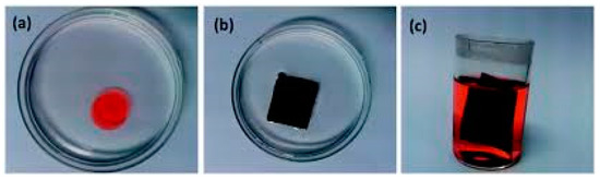 Oil sorption by macroporous electrospun carbon nanofibers, (a) before and (b) after successful sorption. Pump oil was colored with Sudan III for clear visual observation. (c) Recovery of the absorbed oil by immersing into dichloromethane. Reproduced from [136] with permission from The Royal Society of Chemistry.