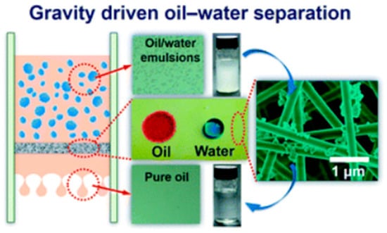 Traditional methods for oily water treatment are gravity separation, adsorption-based technologies, flocculation, coagulation and biological treatments. Fouling, secondary pollutants, low selectivity and inefficiency for separation of emulsified oil/water mixtures are limitation of these procedures. A possible solution could be the use of filters and membrane technology especially in the field of demulsification [138,139]. Nanosized pore diameters in membranes makes them capable of separating emulsions while membranes have lower efficiency in separation of large scaled amounts of oily water compared to meshes (pore size in meshes ~50 µm). Electrospinning has been used as a successful fabrication approach for efficient oil/water separation membranes [140,141].