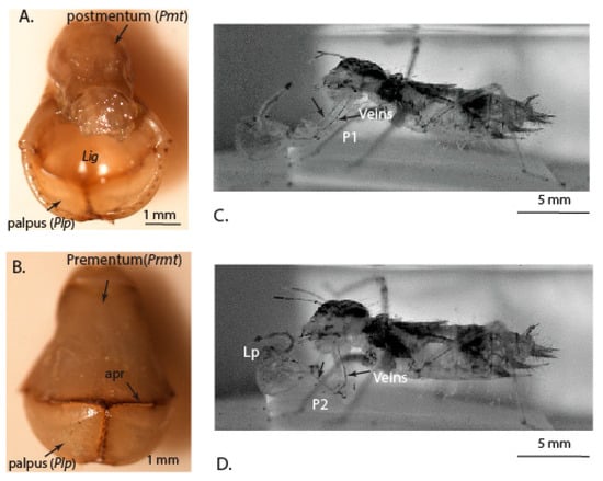 The prey-capturing labium constitutes a postmentum (pmt), prementum (prmt) and labial palpi (Plp), which are connected to the prementum by articulation joints (Figure 1A,B). These parts are moved in co-ordination using concentrated action of the muscles, the articulation joints and membranous structures [7]. A snapshot taken from the high-speed video shows the protraction of the labium with the change in angle of the prementum and postmentum of the labium, and the opening of labial palpi for capturing the prey (Figure 1C,D). We also observe that both the prementum and postmentum are supported by cuticular tendon-like structures running through them (Figure 1C,D). Such tendon-like elements are hypothesized to facilitate in the storage and release of elastic energy in rapid movement musculatures of insects [15].