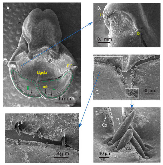 Scanning Electron Micrographs of (A) the labium and palpi (L and R) with setae (black arrows); (B) the prementum-labial palpus joint (plpj) and the articulation joints (J1, J2), which play a crucial role in the movement of the labial palpi during the prey capture; (C) sensillae observed on the edges and surface of the labial palpi; (D) junction of the three mouthparts showing the various types of sensillae; and (E) zoomed region showing the sensillae in pairs along the line of contact of two half labial palpi.