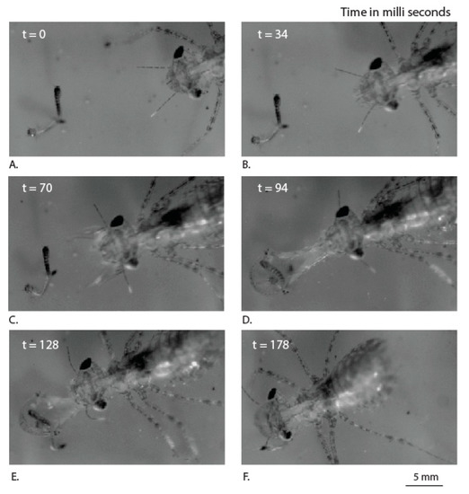 Sequence of movements (top view) used by the dragonfly nymph labium to capture the mosquito larva, at different time points (A–F).