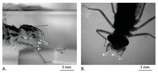 The images of nymph mouthparts were taken using an optical microscope (Lynx LM-1322, OLYMPUS, Tokyo, Japan). Images were captured using a CCD camera (Nikon) attached to the microscope. The dimensions from the images were reported using a standard scale bar in a microscope that was checked with calibration.