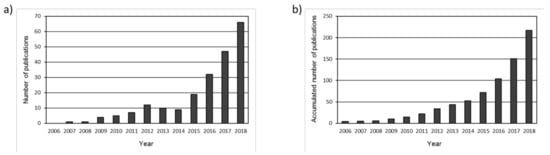 The evolution of the annual distribution of publications and the total number of accumulated documents is shown in Figure 1. The earliest document found was published in 2003: a study that examined the self-heating properties of asphalt concrete when affected by various stresses inside the dam body [32]. In fact, until 2009, only 5 more documents were published regarding self-healing asphalt [33,34,35,36,37]. The data in Figure 1 give a clear idea about the regular increase in publication rates, especially since 2015. This great increase began a rampant evolution of the accumulated number of publications, with good fitting to an exponential model (R2 value equal to 0.995).