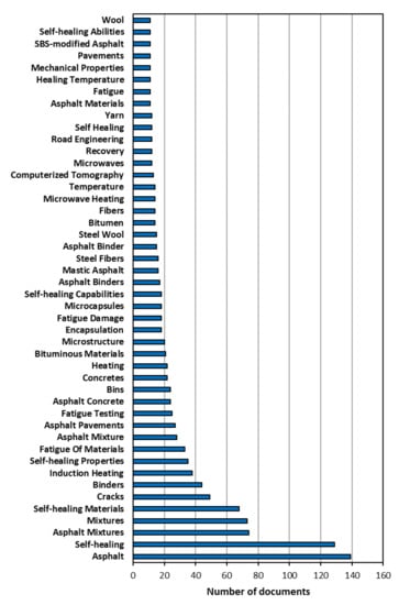 The author keywords highlight the main focus of the research presented in a scientific document. An analysis of these keywords can be employed as a quantitative content breakdown to identify the most important topics and trends in different research fields [61,62]. Since an analysis of the most frequently used author keywords provides valuable information, this work applied this approach. The 46 most frequently used keywords, mentioned by at least more than 10 documents, are shown in Figure 2. Keywords that were directly related to the search terms were very frequent. For example, the first 5 keywords in the ranking (“asphalt”, “self-healing”, “asphalt mixtures”, “mixtures”, and “self-healing materials”) belonged to this category.