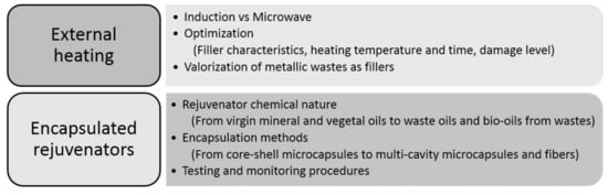 Asphalt mixtures can repair minor damages caused by cracking at the microscale thanks to the development of self-healing bituminous materials, characterized by their ability to self-repair at least partially the damage suffered throughout their service life [63]. Two different approaches have been proven valid in promoting self-healing of cracks in bituminous materials: on the one hand, a direct reduction in the viscosity of bitumen by increasing its temperature through externally applied heating and, on the other hand, the use of encapsulated rejuvenating agents. Nevertheless, recent research has demonstrated the synergistic effects of rejuvenation and crack healing by external heating, which resulted in a longer life extension [64]. A schematic summary about the most important topics related to both approaches according to the found references is shown in Figure 3, and a more detailed analysis of each topic is carried out in the next subsections on the basis of the most significant documents.