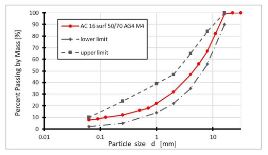The granulometric composition of the stone mixture for preparing the AC 16 surf asphalt concrete mixture is presented in Figure 1.