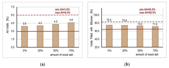 The content of voids filled with bitumen is inversely proportional to the content of the air voids. When the content of voids filled with bitumen exceeds the limit of 82–85%, the asphalt mixture becomes unstable, and the appearance of rutting can be expected. According to [63], for surface layers and heavy traffic, the values of voids filled with bitumen are 65–82%.