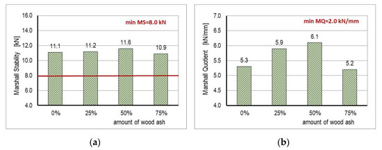 - The results of Marshall stability (MS) and Marshall quotient (MQ) showed that with increased content of WA in the filler up to 50%, the MS and MQ values also increase. Marshall stability (MS) increased by 4.5% (from 11.1 kN to 11.6 kN). The greater stability value divided by deformation indicates a mixture with greater stiffness and an Marshall quotient (MQ) increase by 15.0% (from 5.3 kN/mm to 6.1 kN/mm). The obtained results of MS and MQ had a direct effect on the greater resistance of asphalt to rutting under traffic load. For mixture D, with 75% WA, the MS (10.9 kN) and MQ (5.2 kN/mm) values were lower than the values of the other asphalt mixtures, but even with this reduced stability and stiffness, mixture D met the required Croatian technical criteria for application in the asphalt layer.