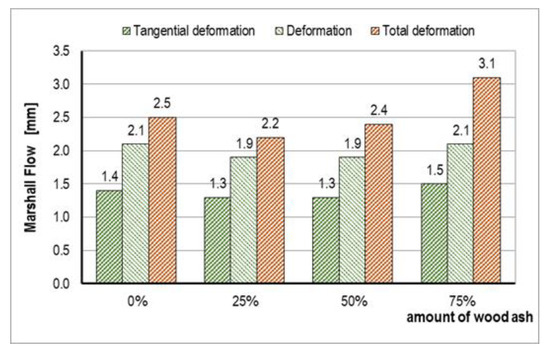 The values of Marshall stability (MS) determined by the standard HRN EN 12697-34 [54] are shown in Figure 7a. They showed an increase in stability values (up to 5%) relative to control mixture A for mixtures B and C. The stability value was the highest for mixture C, with a 50% content of WA in the filler, and was 11.6 kN. For mixture D, with 75% WA, the MS value was lower than the value of the control mixture and was 10.9 kN. The obtained results of Marshall stability can be explained as follows: At lower percentages, the fine-grained composition of WA allowed it to fill in the empty spaces in the binder and improved mastic performance and Marshall stability (mixtures B and C). At higher percentages of WA (mixture D), the round corners and small particles of WA created a flat surface by filling the surface cracks of the aggregates. Therefore, the fastening between the aggregates decreased and causes lower Marshall stability of asphalt mixtures. The above results are consistent with the results obtained by other investigations described in [31,32,33,35]. In addition, the stiffness and adhesion strength of mastic is an important factor in resistance against low temperature cracking due to bitumen oxidation, fatigue cracking, and the appearance of lower resistance on rutting.