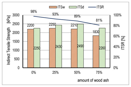 - The indirect tensile strengths ratio results (ITSR = ITSw/ITSd) confirmed good resistance of the asphalt samples to the effect of water. The values ranged from 81% to 98% in all of the tested samples. All three of the mixtures with WA had a lower ITSR value than the control mixture without WA, which indicates that the increase of WA content in the filler resulted in a reduction of ITSR (93%, 89%, 81%). Since mixtures with a higher content of WA are less resistant to water, the optimum content of WA in the filler needs to be limited to 50%.