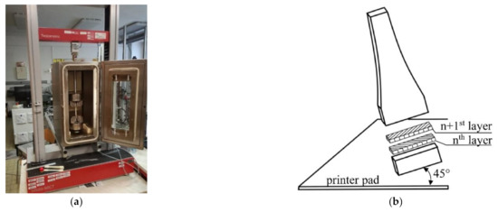 (a) The Testometric M500-50CT tensile testing machine equipped with a temperature chamber. (b) The position of specimens during 3D printing and the method used to layer the material.
