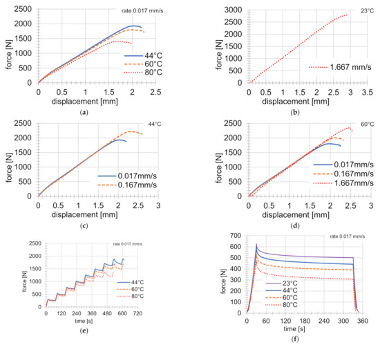 All tensile tests were deformation-controlled. Simple tensile tests were performed at four different temperatures (23 °C, 44 °C, 60 °C, and 80 °C) and at three different rates of deformation (0.017 mm s−1, 0.167 mm s−1, and 1.667 mm s−1) until specimen failure. Figure 3a shows the force against the displacement at 44 °C, 60 °C, and 80 °C, at a constant deformation rate of 0.017 mm s−1 (the constant test parameters are shown in the upper right corner of the diagram). It can be seen from the figure that the maximum force value decreased with increasing temperature, however at the beginning of the test the courses of the force were quite similar. One experiment was performed at room temperature, but with the highest deformation rate of 1.667 mm s−1 (see Figure 3b). Figure 3c,d shows the force dependence at 44 °C and 60 °C and at the specified deformation rates. The magnitude of the rate of the deformation had no significant influence on the force course at the beginning of the tests, but led to higher maximum force values at the end of the tensile tests.
