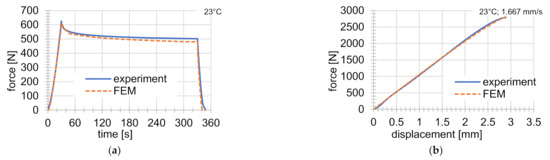 Comparison of experiments with FEM solutions: (a) indentation test at 23 °C; (b) tensile test at 23 °C and rate of deformation of 1.667 mm s−1.