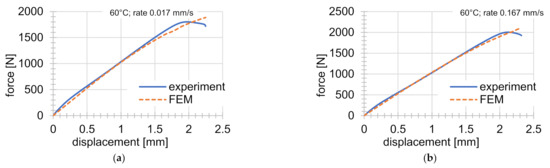 Very good agreement can be seen between the experiments and the FEM solution. Different behavior just before the failure of the specimen is shown in Figure 5a,b,d–f,h. This behavior is less significant under lower temperatures and higher deformation rates. The difference can be seen in Figure 5a,f especially (temperatures of 60 and 80 °C and deformation rate of 0.017 m s−1). This effect was not captured in the simulations.