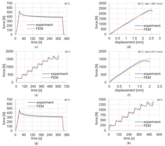 Comparison of experiments with FEM solutions (continuation): (a) tensile test at 60 °C and rate of deformation of 0.017 mm s−1; (b) tensile test 60 °C and rate of deformation of 0.167 mm s−1; (c) indentation test at 60 °C; (d) tensile test at 60 °C and rate of deformation of 1.667 mm s−1; (e) graded tensile test at 60 °C; (f) tensile test at 80 °C and rate of deformation of 0.017 mm s−1; (g) indentation test at 80 °C; (h) graded tensile test at 80 °C.