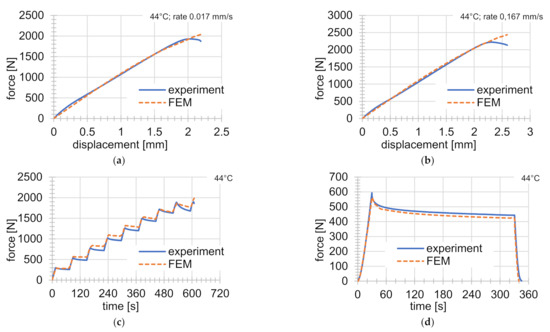 Validation testing was carried out on a series of experiments at 44 °C. Experiments at this temperature were not used for material parameter identification. The results are shown in Figure 6. In Figure 6, a very good agreement can be seen between FEM solutions and experiments. The greater error occurs just before the failure of the specimen, as also mentioned in the previous chapter. The conclusion is that the material models with those material parameters do not accurately describe the mechanical behavior shortly before the sample ruptures. In order to describe this area of difference better, more experiments will be necessary, especially focused on this small area. If no experiments of this kind are carried out, the influence of this small area on the value of the objective function is negligible.