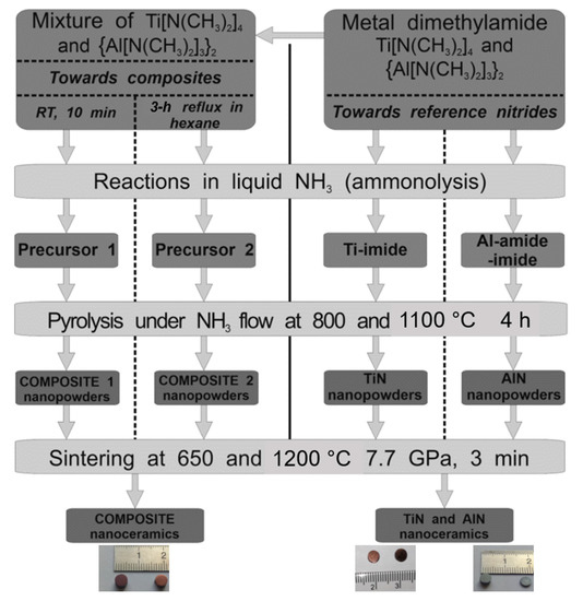 Schematics of experimental steps in anaerobic synthesis and subsequent high pressure and high temperature sintering of composite and individual nanopowders in the system TiN-AlN. Snapshots of typical pellets/nanoceramics are shown on the bottom as follows: (left)—brown composite pellets; (right)—golden-brown TiN pellets and graphite-grey AlN pellets.