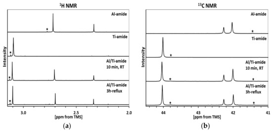 In order to check the possibility of the mixed Ti/Al-dimethylamide species formation, the 1H and 13C NMR spectra were collected after the equilibration steps of the Precursors 1 and 2 routes (Figure 2).