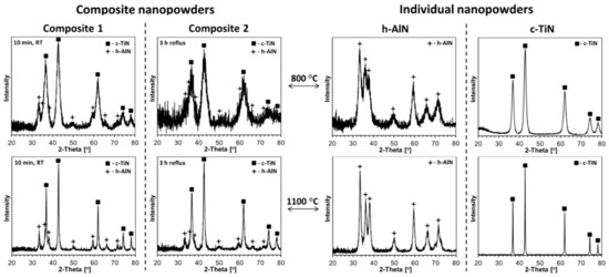 The XRD patterns for the nanopowders from two composite nitride processing routes (Composites 1 and 2) and reference pure nitrides (h-AlN and c-TiN), all prepared at both 800 and 1100 °C, are presented in Figure 3. The calculated cell parameters for h-AlN and c-TiN in composites and in individual nitrides as well as estimated average crystallite sizes are included in Table 1.