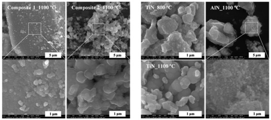 The scanning electron microscopy examination of the powders confirmed their homogeneity on a submicron scale as demonstrated for the morphologically typical cases of Composites 1 and 2 prepared at 1100 °C (Figure 5). They both appear to be built of blocky aggregates made of smaller, quite uniformly sized submicron particles. These particles are as-if glued, forming a few hundred nanometer large agglomerates that, based on XRD data, contain still smaller nanosized crystallites with the latter too small to be discerned in the SEM images (Table 1, Figure 5, left panel). Those agglomerates seem to be, on average, larger sized for Composite 2. No element mapping was done for the composite nanopowders since, due to varying thickness of the aggregates and the relatively large probing areas of standard EDX mapping, the resolution details below ca. 1 micrometer are not reliably discernible. However, scattered point EDX examination (not shown) reveals that, despite the apparent particle uniformity, there are adjacent areas, with separation of a few micrometers, characteristic of significant variations of one order of magnitude in the relative amounts of Al and Ti. This is consistent with the precursors composed of nanosized domains made of AlN or TiN mixed on the submicron scale, whereas no nitride-specific distinct morphological features are observed. This is not true for the individual nitrides (Figure 5, right panel). On the one hand, the morphology of the TiN powders well reflects the earlier discussed morphology of the derived composites, especially, for the 1100 °C nitridation. On the other hand, the pure AlN prepared at 1100 °C shows relatively long nano-whiskers grown on the surface of micron-sized blocky aggregates. The abundant presence of the whiskers suggests a share of vapor phase crystal growth participating in the formation of bulk AlN from the solid Al-amide-imide precursor. Such high surface area features may have a specific impact on sintering of pure AlN powders. The lack of whiskers in the composite nitrides is therefore significant and points to negligent participation of vapor phase crystallization and to morphological homogeneity.