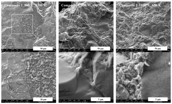 The characteristic feature of all Composite 1 and some Composite 2 ceramics is the presence of two quite well intermixed and relatively large (several tens of micrometer) and distinct domains, each with specific appearance, i.e., solid, dense looking/homogeneous islands with smoothly fractured surfaces as if embedded in an irregularly fractured spiky matrix. It is very likely that this results from various strength field distributions within the compressed microsized domains that show up as different crack-originated features, i.e., highly homogeneous for the flat surfaces and rather variable over shorter distances in the spiky areas. Under the highest magnifications, the solid areas are shown to consist of very similar in size and densely agglomerated crystallites in the several tens of nanometer range. Clearly visible are regular interfaces between the two types of domains (see the higher magnifications). Similar morphology characteristic of uniform nanosized crystallite agglomerates is found for the spiky matrix, too. This is a general feature of all these ceramics independently of whether the sintering temperature supports crystal growth (Figure 6, left) or the temperature is anticipated to be neutral to recrystallization (Figure 6, middle and right) in sintering. However, in the former case the domains become clearly porous with a share of closed microsized pores; apparently, recrystallization phenomena that are associated with intense mass transport/diffusion cause formation of the voids despite the applied compressing high pressure. All this is, generally, also true for fractured fragments of Composite 2 pellets, but the pores appear to be smaller-sized if there are any.