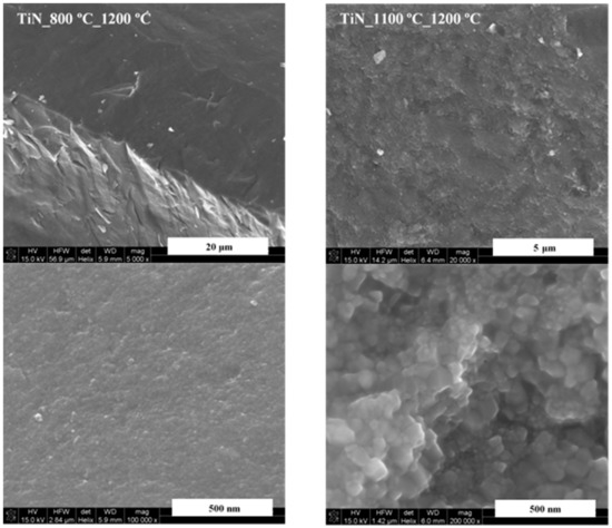 The fractured TiN ceramics display homogeneous solid dense surfaces that, upon magnification, are shown to be made of very similar in size but smaller crystallites in the nanosized range (Figure 7). A notable difference in crystallite size can be seen between the 800 °C and 1100 °C-powders sintered at 1200 °C, namely, much bigger and regularly shaped cubic crystallites of varying sizes are encountered in the latter case (Figure. 7, bottom images).