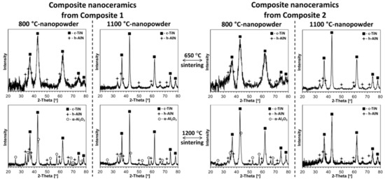 The powders prepared from molecular Precursors 1 and 2 were labeled, respectively, Composites 1 and 2 with an additional reference to nitridation temperature. For example, for Precursor 1, after nitridation at 800 and 1100 °C, two products were obtained, i.e., Composite 1_800 and Composite 1_1100, respectively, etc. The powders made from pure metal precursors were the individual nitrides of TiN and AlN and were labeled accordingly. For example, for Ti-imide pyrolyzed at 800 and 1100 °C, the two powder products were, respectively, TiN_800 and TiN_1100, etc. The sintered ceramics had names of the related nitride powders with suitable postfixes for sintering temperature, e.g., Composite 1_800_sint_650 or TiN_1100_sint_1200, etc.