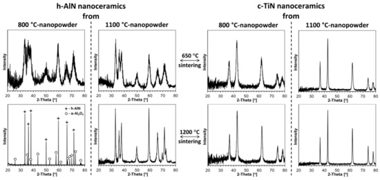 XRD patterns of single nitride nanoceramics sintered from individual nanopowders of h-AlN (left panel) and c-TiN (right panel) at 650 and 1200 °C, 7.7 GPa. Note some α-Al2O3 content in bottom corner of left panel for non-standard partially oxidized AlN-800 °C powder then sintered at 1200 °C.