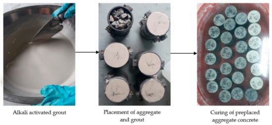 The SSD condition coarse aggregates were initially placed into a cylindrical mold with a diameter of 100 mm and height of 200 mm. The alkali-activated grout was prepared by dry mixing the solid precursors for one minute. The required alkali-activating solution was then added and mixed for three minutes to obtain a homogenous mix. The freshly prepared alkali-activated grout was then poured into the mold containing the preplaced coarse aggregates. A gravity-based grout injection was considered in the present study due to its convenience in casting and its economic benefit. The casting process is shown in Figure 1. The molds were covered with plastic sheeting for 24 h to prevent evaporation loss. The specimens were then demolded and kept for water curing at room temperature until they were tested.