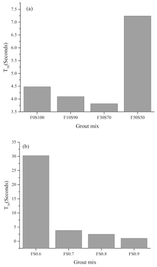 Flowability of alkali activated grout as observed by T30 time: (a) Series 1 and (b) series 2.
