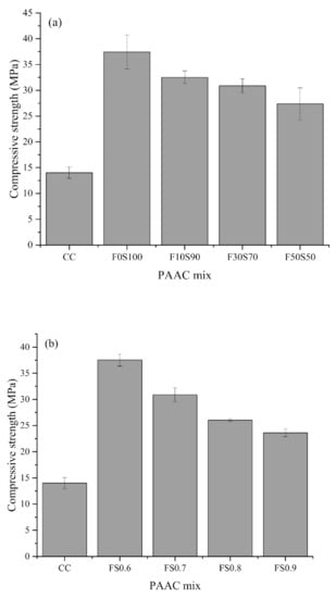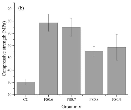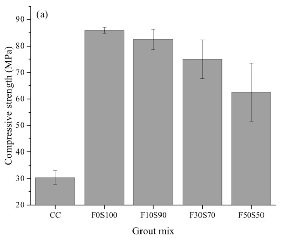 Figure 5 shows the 28-days compressive strength of the PAAC specimens produced with different types of grout. It can be observed that the compressive strength of PAAC is fairly well correlated with the compressive strength of the grout. Specifically, the F0S100 specimen registered an increase of almost 166% in the compressive strength as compared to CC. Previous studies demonstrated that the compressive strength of PAAC is governed by the interlocking and strength of the coarse aggregate [38,39]. In the present study, the additional influence of the binding grout along with its flowability could be identified as factors influencing the compressive strength of the preplaced concrete.