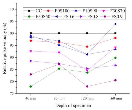 The UPV values of the PAAC mixes are presented in Table 3. Figure 6 presents the filling capacity of the grout mixes at various specimen depths. The filling capacity was determined by evaluating the relative pulse velocity of each specimen at different depths. To provide a baseline for the measurements, the CC mix was considered as the ideal case scenario, with a relative pulse velocity of 100%. The successive relative pulse velocities of the PAAC mixes were calculated in relation to the CC mix. It can also be observed in Table 3 and Figure 6 that the increase in the fly ash content in the alkali-activated grout mixes resulted in lower UPV values. In the F0S100 mix, higher concentration of CaO-rich slag led to the formation of additional C-S-H and C-A-S-H gels through the alkali-activation reaction mechanism [42]. The production of these gels reduced the porosity and provided a denser medium, which is reflected in the UPV values. In the mixes with increased percentages of fly ash, the slower reaction rate of the fly ash reduced the formation of alkali-activated reaction gels, which resulted in decreased UPV values [43]. Additionally, it should be noted that FS0.6 registered the highest UPV at a depth of 160 mm for the alkali-activated grout samples. The increase in the solution-to-binder ratio did not necessarily result in a better filling capacity. The increase in the porosity due to the higher solution-to-binder ratio can be considered as a major factor behind such a phenomenon. The excess moisture in case of high solution to binder ratio gets leached out of the alkali-activated binder [44]. The loss of moisture results in a weak and porous structure thereby lowering the UPV values.