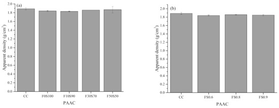 Figure 7, Figure 8, Figure 9 and Figure 10 summarize the bulk density, apparent density, water absorption by immersion, water absorption after boiling, and total voids of the PAAC mixes. It can be observed that the use of alkali-activated grout resulted in similar bulk density, lower apparent density, water absorption, and porosity outcomes in PAAC. The bulk density considers both the solid volume and closed and open voids, whereas the apparent density excludes open voids. The measurements show that the use of alkali-activated grout in PAAC lowers the apparent density, which suggests a difference between the filling mechanisms by CC and the alkali-activated grout. However, it should be noted that the incorporation of fly ash in amounts exceeding 10% resulted in an increase in the apparent density for PAAC.