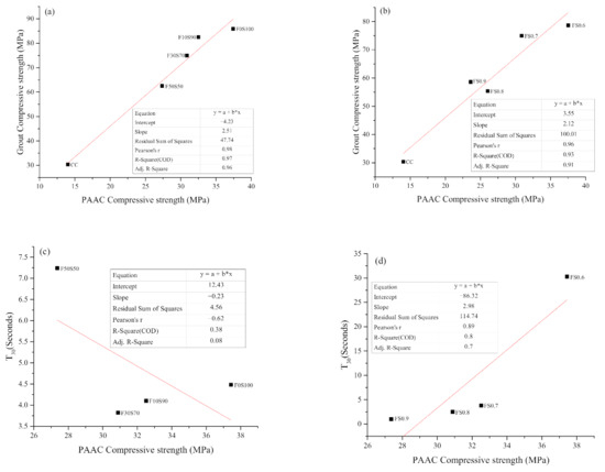 Correlation between grout and PAAC compressive strength: (a) Series 1 and (b) series 2, and, correlation between flowability of grout and PAAC compressive strength: (c) Series 1 and (d) series 2.