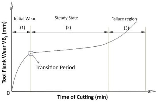 As is well understood in the literature, the tool wear index is generally referred to as the maximum permitted flank wear (vBmax) that can be measured in the course of the cutting process, and the corresponding results can be observed in the tool wear curve [5]. According to Figure 1, three typical sections exist in the tool wear curve. As noted in [6], the main wear modes are initial or running-in period (I), steady wear within the steady-state (II), and accelerated wear (III) [7,8]. It has been known that both initial and steady wear periods occur very fast in the machining of superalloys, including Inconel 718. To prolong the tool life, one solution is to assess the wear modes and morphologies in both states and employ the adequate cutting parameters and lubrication strategies to reduce the presence of wear modes aforementioned. To that end, several studies were conducted to understand the wear modes in the steady-state wear period [9,10]. The capability of three well-known cutting tool materials including PVD-TiAlN coated carbides, Al2O3-TiC ceramic, and CBN in the turning of Inconel 718 was studied by Xavier et al. [11] with various cutting speeds (60, 80, and 120 min), feed rates (0.08, 0.10, and 0.12 mm/rev), and depth of cuts (0.2, 0.4, and 0.6 mm). It was revealed that the most suitable cutting speed for carbide inserts is 90 m/min at which the minimum value of the maximum vBmax was achieved. On the other hand, Xavier et al. [11] investigated the vBmax in three different cutting tools including PVD TiAlN coated carbide, Al2O3–TiC ceramic, and CBN tools, and revealed that the optimal conditions for dry-cutting, MQL, and flood cooling are: cutting speed of 90 m/min, feed rate of 0.16 mm/rev, and depth of cut of 0.4 mm [12].