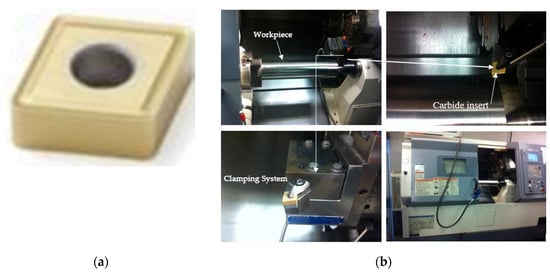 The workpiece used was a cylindrical Inconel 718 with the nominal bulk hardness and tensile strength of about (RC) and 1100 MPa, respectively. This was delivered in the shape of a cylindrical bar with a diameter of 114 mm and the chemical compositions based on the weight percent of elements (wt %) listed in Table 1. The cutting tool used in all experiments was carbide/cermet inserts CNMG 432-MR4 TS2500 coated with TiCN/Al2O3 (CVD), which was fabricated by Seco, Inc. (Figure 2a, Montreal, Canada). The CNC-MAZAK Nexus 200 (MAZAK, Montreal, Canada) was applied in the turning tests (Figure 2b). It ought to be noted that to prevent the coolant effects, experimental tests were undertaken under dry conditions. The experimental works were performed twice, and the average values of the obtained vB were utilized in successive studies. A new and sharp insert edge was used in each machining test. The following cutting angles were used in the experimental tests: rake angle γ0 = −6°, back rake angle γp = −6°, nose radius Rϵ = 1/32 mm, tool cutting angle kr = 95°, and insert thickness s = 3/16 mm.