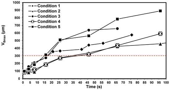 As can be seen in Table 3 and Figure 3, the use of a lower feed rate (condition 4) at the transition period led to better tool life as compared to the reference condition (condition 1), while less tool life was recorded when the higher feed rate was used in the transition period (condition 5). In other words, increasing the feed rate from 0.15 to 0.35 mm/rev in the transition period led to increased flank wear (vBmax) from 111.0 to 126.0 μm at the end of the transition period (t = 4 s), respectively. Similarly, a higher cutting time, more rapid tool wear was shown. Knowing that a vBmax of 300 μm is considered as the maximum permitted tool wear size in most of the reported works, ultimately, the permitted cutting time at the vBmax of 300 μm was dramatically decreased from 38.5 to 15.1 s when the initial feed rate was changed from 0.15 to 0.35 mm/rev, respectively. Similarly, compared with reference mode (condition 1), the permitted cutting time at the vBmax 300 μm was dramatically decreased from 33.9 to 17.4 s when the cutting speed was changed from 25 m/min to 65 m/min.