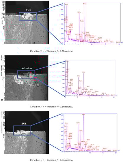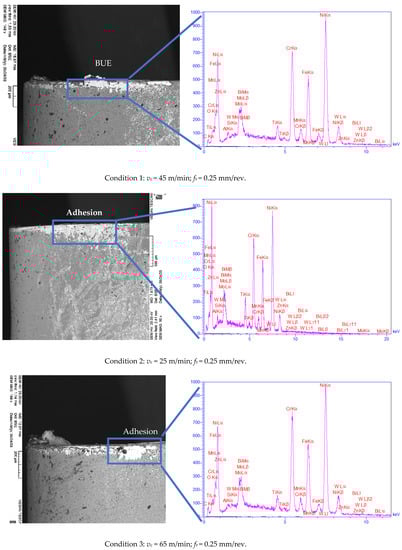 The analysis and assessment of wear morphologies and mechanisms were conducted from SEM and EDX techniques. As shown in Figure 4, slight BUE formations were observed on the SEM images of the cutting tools within the transition period. It can be noted that the BUE formation was exclusively observed in the cutting processes with the initial cutting speed of 45 m/min (Figure 4, conditions 1), while almost no BUE was detected when the initial cutting speeds of 25 and 65 m/min were employed (Figure 4, conditions 2 and 3). On the other hand, the adhesion mechanism was observed in all inserts (Figure 4, conditions 1–3). Besides, as shown in Figure 4, the flank wear observed in all three workpieces increased by higher initial cutting speed. These results further confirmed that the use of an initial cutting speed 25 m/min resulted in lower flank wear (Figure 4, condition 2). Furthermore, upon applying the lower initial cutting speed (i.e., vc = 25 m/min), almost double cutting time was resulted at vBmax of 300 µm as compared to the other tested conditions. In other words, lower cutting speed led to 50% improvement in the tool life as compared to conditions 1 and 3 with higher cutting speed (Figure 3). Furthermore, the SEM analysis of cutting tools in steady-state at t = 26 s (Figure 5) revealed that all the cutting tools experienced severe BUE formation and adhesion. However, BUE formation was much more severe under conditions 1 and 3 in comparison with findings related to condition 2. Abrasion was also noticed in the tests. However, due to lack of space, only EDX analysis of BUE formations was presented in this work.