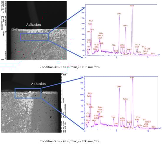 Figure 4 and Figure 5 depict the SEM and EDX images for the wear mechanisms observed at different conditions. The wear mechanisms observed were mainly adhesive, abrasive, and BUE on the tool flank face. The abrasive wear is a result of the presence of hard particles and impurities within the workpiece material [34], such as carbon, nitride, and oxide compounds, as well as built-up fragments. The adhering material became a stable BUE protecting the face. The adhesive wear is due to the high temperature and pressure during cutting, which causes micro welds between the clean and fresh surfaces of the chip and the rake face [3].