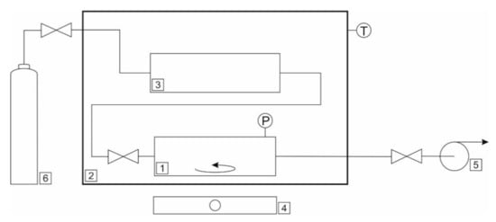 Schematic diagram of the equipment used for CO2 solubility measurement is presented in Figure 2. The experimental setup consisted of a stainless steel equilibrium chamber (1) equipped with a water jacket connected to the water bath temperature controller (PolyScience 9106, Warrington, PA, USA) (2), to a gas container (3) and to a vacuum pump (5). The equilibrium cell had a magnetic mixer (IKA, Staufen im Breisgau, Germany), (4) in order to mix the fluids and to provide that equilibrium state was reached faster. The volume of the cell was 7.8 ± 0.01 cm3. A volume of about 1 cm3 of DES was injected to the cell. The actual amount was determined gravimetrically using RADWAG analytical balance. The cell, absorbent and gas container were degassed with the vacuum pump (VALUE, Wenling, China). The gas container was then filled with CO2 from a gas reservoir (6). Subsequently, both the equilibrium cell and the gas container were thermostated at a given temperature. The experimental uncertainty for the temperature was ±0.1 K. When the temperature of fluids was equal and stable, the gas was injected to the equilibrium cell and a starting pressure was recorded. The pressure was measured by an Aplisens PC-28 transducer. As the CO2 was absorbed, the pressure in the cell decreased. When the equilibrium was reached, meaning the pressure in the cell did not change, the equilibrium pressure was recorded. The amount of CO2 absorbed was calculated using Equation (1).