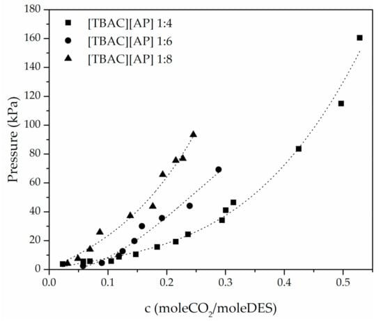 Viscosity plays a key role in mass and heat transfer and affects the economy of the process, operation parameters and the design of the unit itself. Among examined DESs [TEAC][AP] showed the lowest viscosity, and a higher one was observed for [TBAC][AP] and the highest for [TBAB][AP]. This affected the overall solvent transport properties, i.e., kinetics of absorption and the time of equilibration.