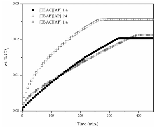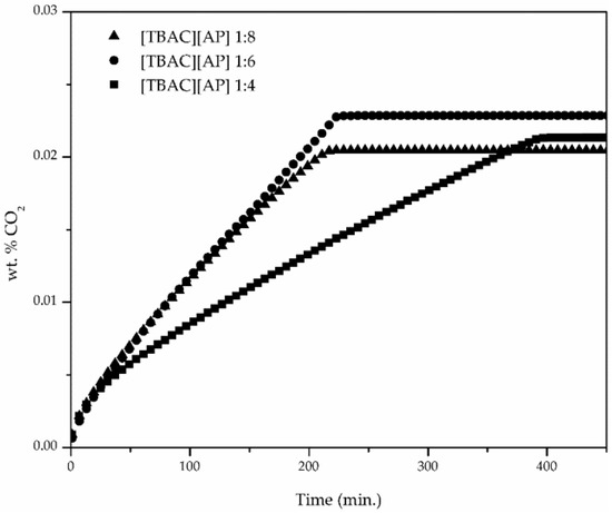 The rate of CO2 absorption for DESs with different molar ratio of HBA:HBD is shown in Figure 5. The graph applies to the first measuring point for each liquid, however, at different CO2 pressures, the trend does not coincide with the total CO2 capacity of the DESs. In the first 20 min of absorption after the CO2 was introduced to the cell, the rate of the absorption was similar for all three molar ratios. Then, there was another approximately 20 min when the rate of absorption was in the following order—1:8 > 1:6 > 1:4, which was in agreement with the initial viscosity of the pure DESs (Table 2). After that, the rate of the process dramatically decreased in the case of 1:4 DES whereas the 1:6 and 1:8 solutions stayed close. A temperature increase during the stage of high absorption rate was not observed, however the temperature inside the cell was not directly measured, but the measuring cell was kept in the thermostated water bath of a high volume in comparison to the volume of the cell. Taking into account the highly exothermic reaction and its effect on viscosity and energy of the system, it is likely that thermal effects play an important role in that phenomena and it is worth evaluating together with the changes of viscosity during the absorption. In comparison to different HBAs with the same HBA:HBD ratio, the absorption rate at the initial stage was the highest for DES with the highest viscosity, and the lowest for the [TEAC][AP], which has the lowest viscosity (Figure 6). Until equilibrium was reached, the rate for DESs based on the chloride salts stayed close, whereas for [TBAB][AP] the rate was much higher.