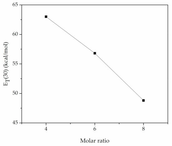 Detailed results and analysis of physicochemical properties were provided elsewhere by Nowosielski et al. [23]. Within this paper, viscosity at 298.15 K and at atmospheric pressure (p = 0.1 MPa) and solvatochromic parameters at room temperature are presented. As the 3-amino-1-propanol is liquid at room temperature with viscosity of 30.43 mPa·s [28], while the HBA is not, the viscosity of all DESs is higher than that of pure [AP] and decreases with the increase of HBD to HBA ratio. As can be seen from Table 2, the experimental values of solvatochromic parameters were in good agreement with values found in the literature.