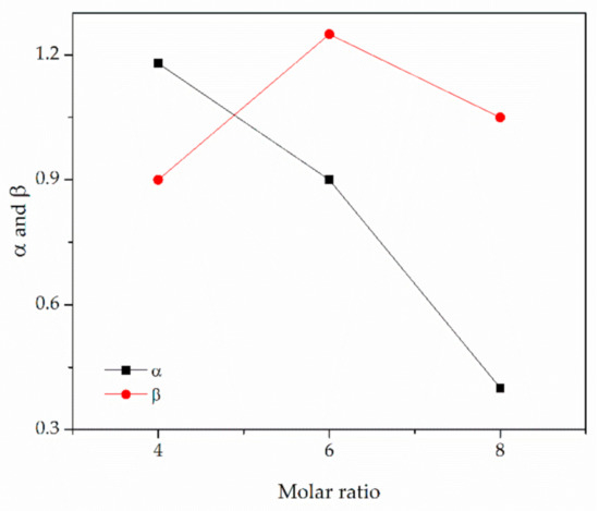 Taking into account ET(30), it was observed that the higher electronic transition energy results in higher CO2 solubility (Figure 7). Moreover, as described by Shukla et al. [31] the relative value of α-β describes the nature of interactions between DESs and CO2. The closer the strengths of the donor and acceptor are, the more favored the synergistic action and the higher the CO2 capacity observed (Figure 8). This phenomenon can be considered in the prediction of the optimum HBA:HBD ratio for a specific DES, though it should not be used for comparison of DESs with different types of composing agents. This was confirmed by Shukla and Mikkola [25] who studied [TBAB][AP] and [HMIMCl][AP] and observed an increase in CO2 capacity with increasing [AP] content, due to the favored synergistic effect. Our results confirm that the CO2 uptake in DESs depends on the equilibrium between α and β that describes the intermolecular interactions between the HBD and HBA.