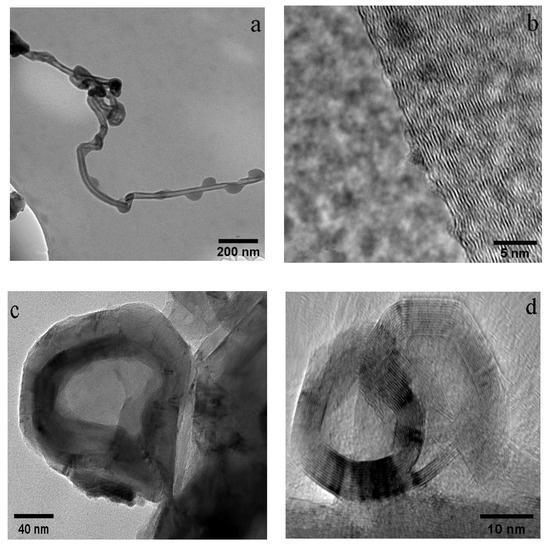 Figure 2c,d show the TEM and HR-TEM images of CNOs, respectively. After purification, some carbon onion cores became hollow. The hollow cores measured approximately 100 nm in diameter. The HR-TEM images clearly showed the multi-layer graphitized structure of the CNOs. The Fe-Ni alloy was the nucleation center of the carbon nano-onion formation. Methane was first decomposed into carbon atoms on Fe-Ni. Carbon atoms penetrated into the alloy to form metal carbides. Around the metal carbide catalysts, methane was further cracked and formed a multi-layered graphitic structure [67]. From the HR-TEM images, it was observed that in CNTs, the graphitic layers are not exactly parallel to each other, indicating the existence of defects. In CNOs, some graphitic carbon shells networks were not perfectly closed, indicating the existence of more defects.