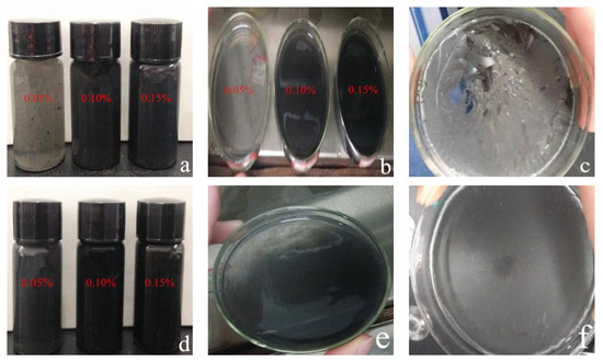 Visual appearance of WPI fibril–carbon nanocomposites: (a,b) WPI fibril–CNT composites in glass vials and dishes with different CNT concentrations; (c) WPI fibril–CNT (0.10 wt.% CNT) composites after drying at 60 °C for 48 h; (d) WPI fibril–CNO composites in glass vials with different CNO concentrations; (e,f) WPI fibril–CNO composites (0.10 wt.% CNOs) before and after drying at 60 °C for 48 h.